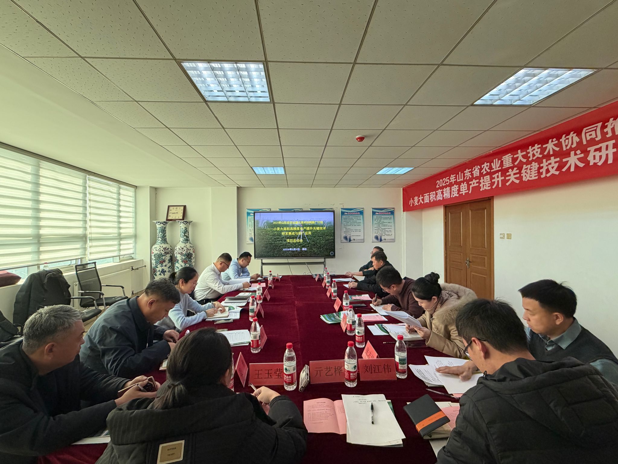 为推进2025年立项的山东省农业重大技术协同推广计划——小麦大面积高精度单产提升关键技术研发集成与推广应用项目落地,2月9日,山东省农林职教集团理事长单位潍坊职业学院院长韩瑞东率团队赴潍坊市农业科学院开展专项对接交流。潍坊市农业科学院院长袁柳天、潍坊市农业农村局科教科科长王文卓、潍坊市农技中心粮经科科长袁永胜,潍坊市农业科学院小麦所负责人于海涛、山东农业大学农学院代兴龙副教授,以及各方项目团队相关成员参与活动。